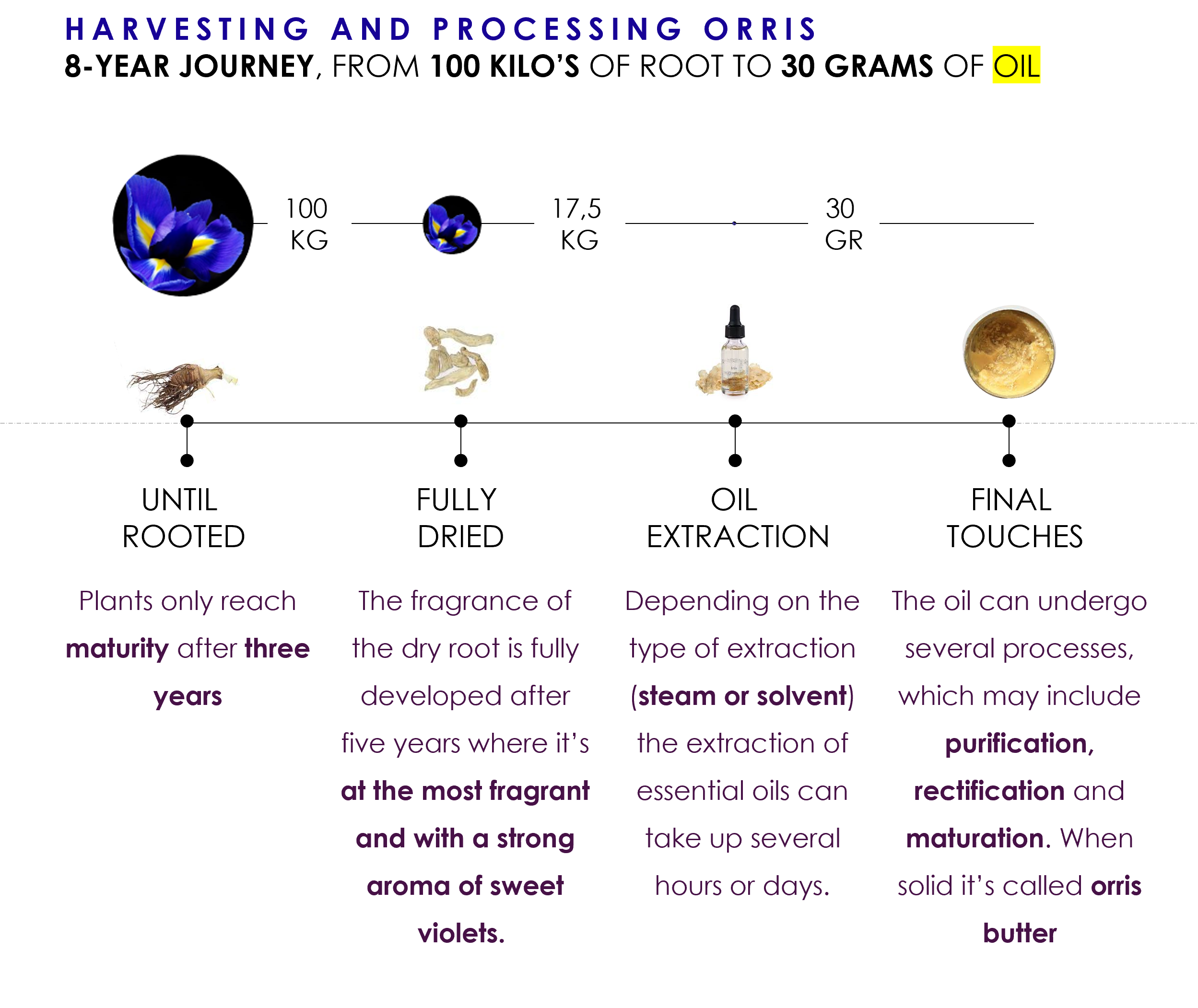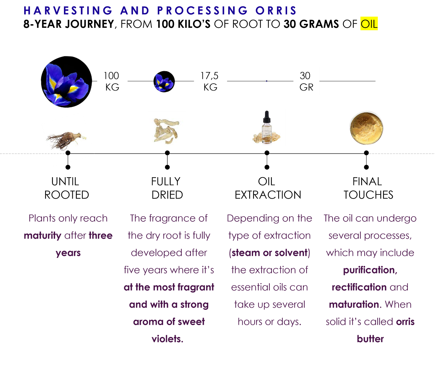 The extraction of essential oil from orris root is typically done through steam distillation or solvent extraction. Both methods involve a series of steps, including drying and aging the rhizomes, to enhance the development of the desired fragrance. But this is the “easy” part.